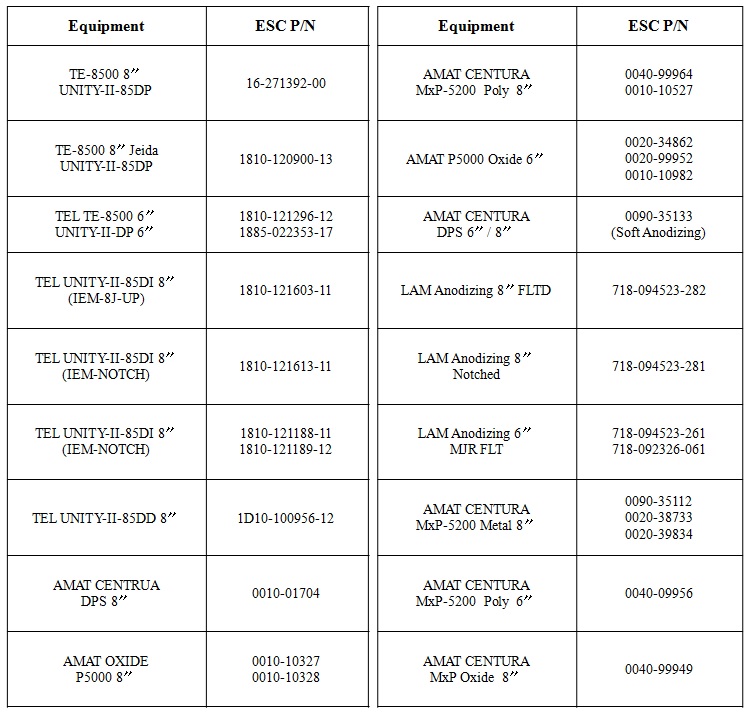 Polymide ESC's are widely used on semiconductor manufacturing equipment such as AMAT, LAM, TEL.